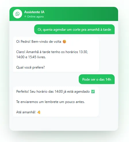 - Agendamento sem app extra: tudo acontece no mesmo WhatsApp que o cliente já usa.